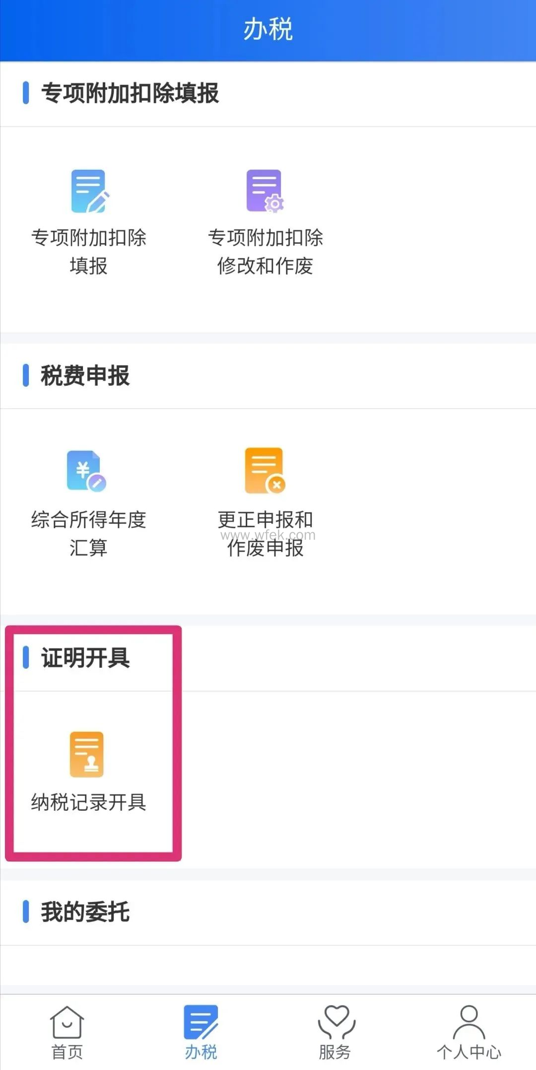 1. 登录个人所得税手机APP,通过点击首页上方的“我要办税”、或者页面下方的“办税”,找到“证明开具”-“纳税记录开具”,进入纳税记录开具功能模块。