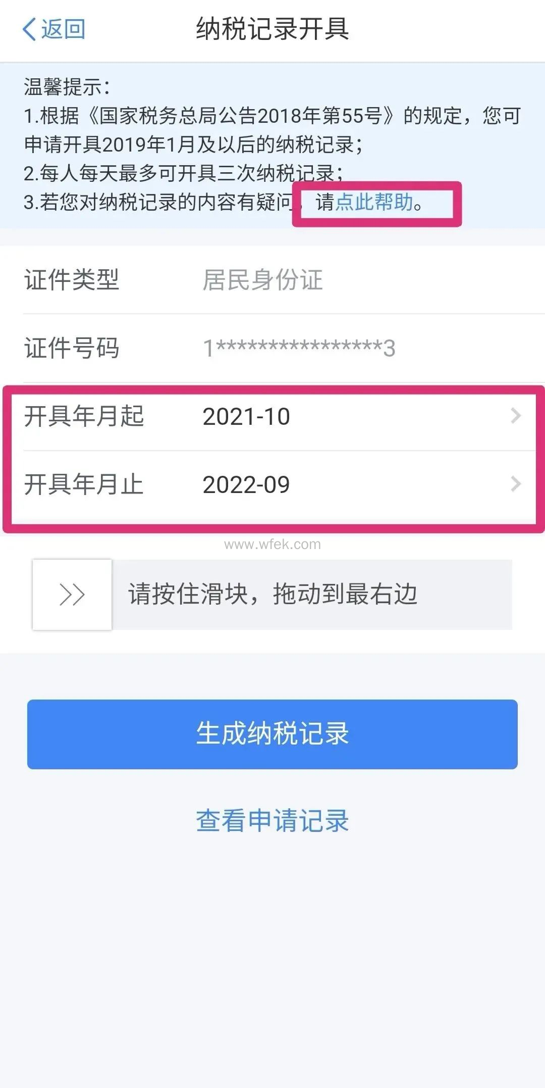 输入您需要开具的具体年月(可跨年),滑动滑块完成验证,点击“生成纳税记录”。