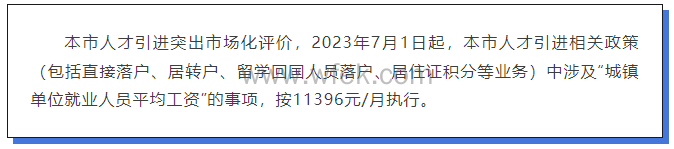 上海市人才引进突出市场化评价,2023年7月1日起,本市人才引进相关政策(包括直接落户、居转户、留学回国人员落户、居住证积分等业务)中涉及“城镇单位就业人员平均工资”的事项,按11396元/月执行。
