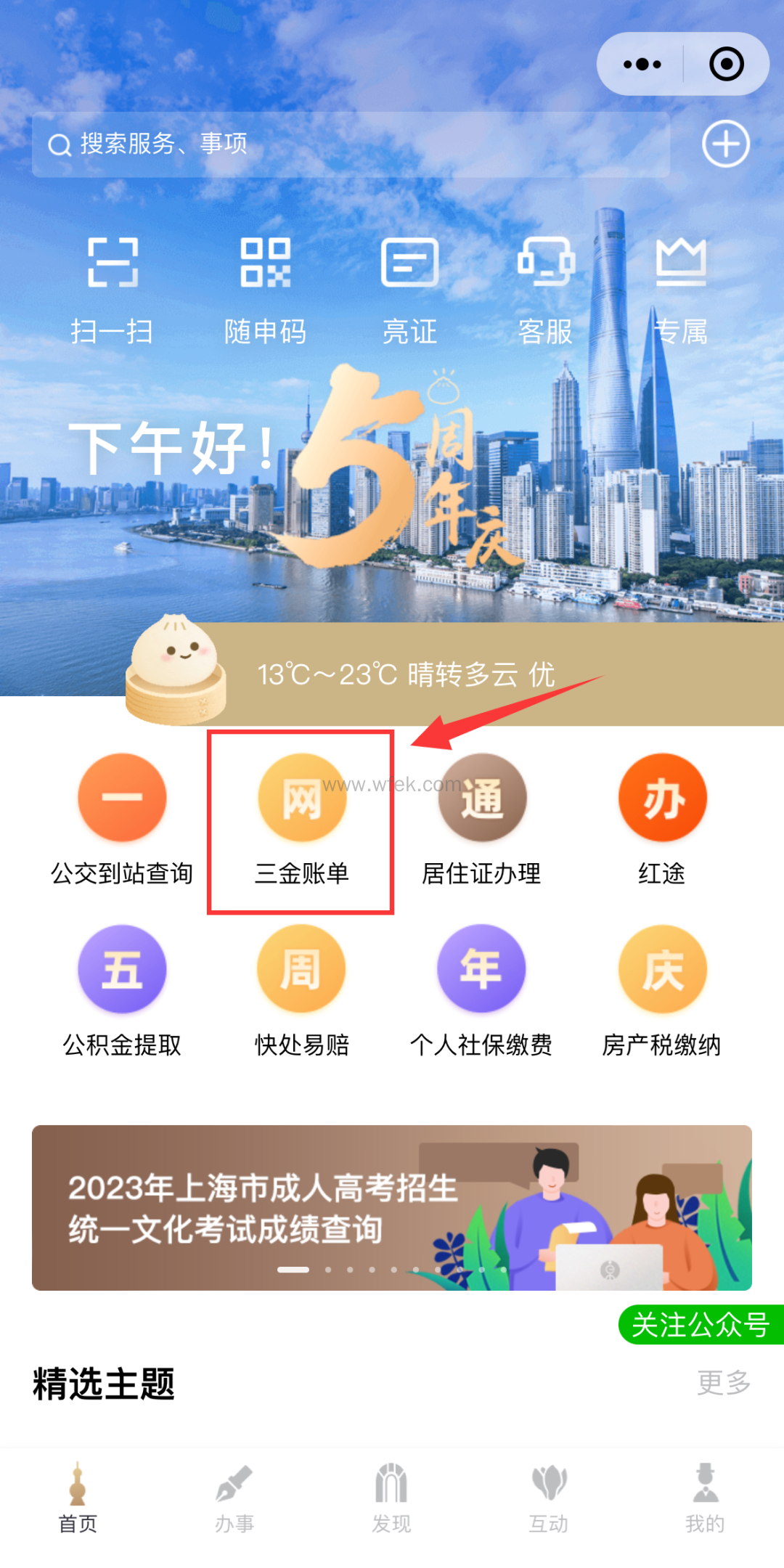 1、打开随申办app(app或小程序都可)打在首页选择“三金账单”。