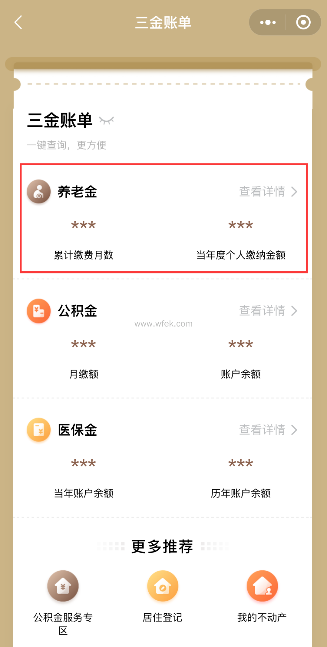2、登录账号后,进入三金账单页面,点击“养老金”。