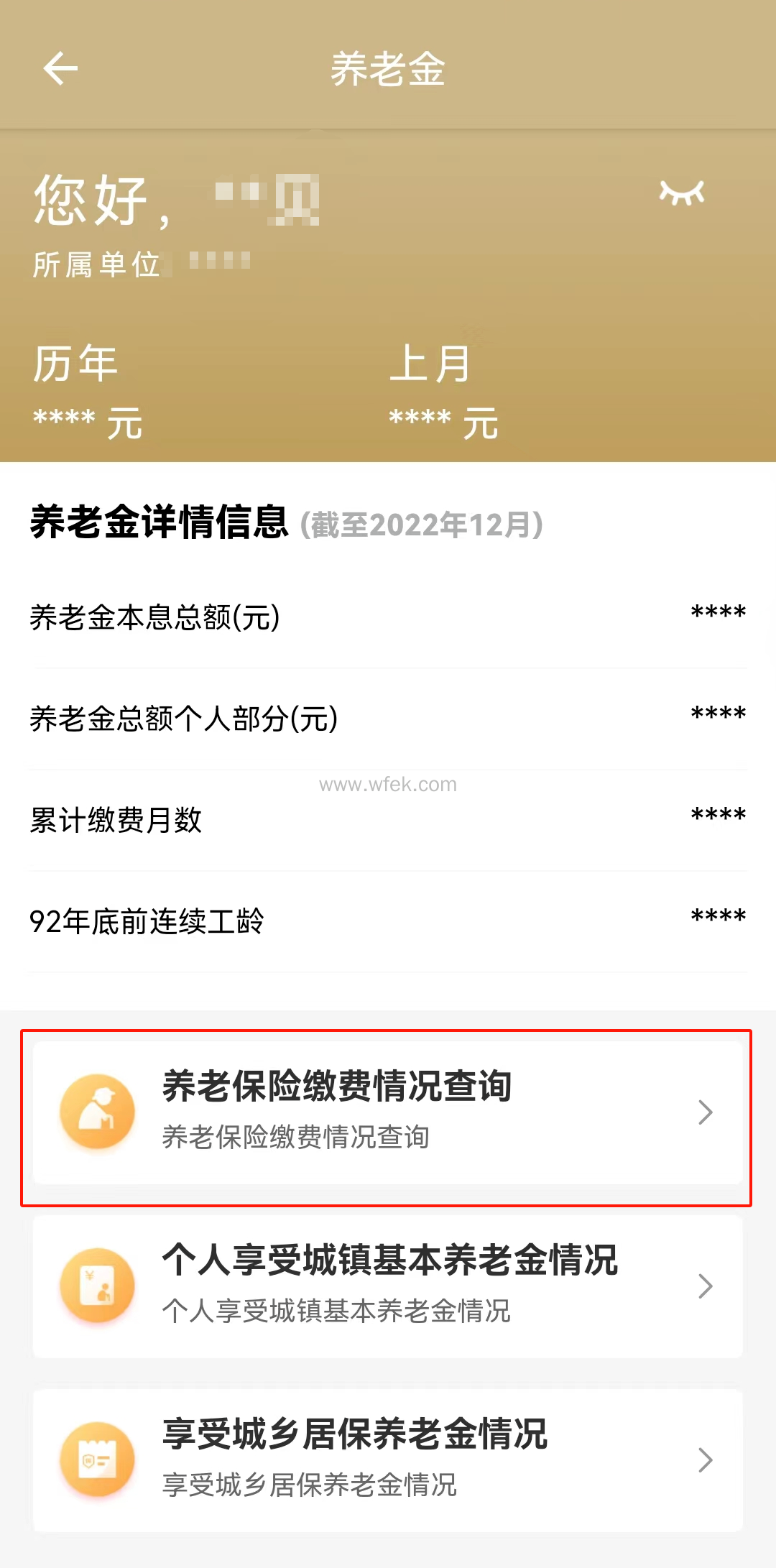 3、点击“养老金详情信息”下方的“养老保险缴费情况查询”。