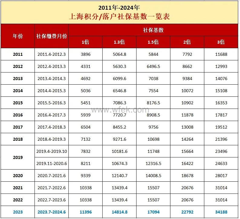 注意:有计划落户上海或者申请居住证积分的小伙伴可以查看下图,比对历年上海社保基数来做自己的积分或落户规划。